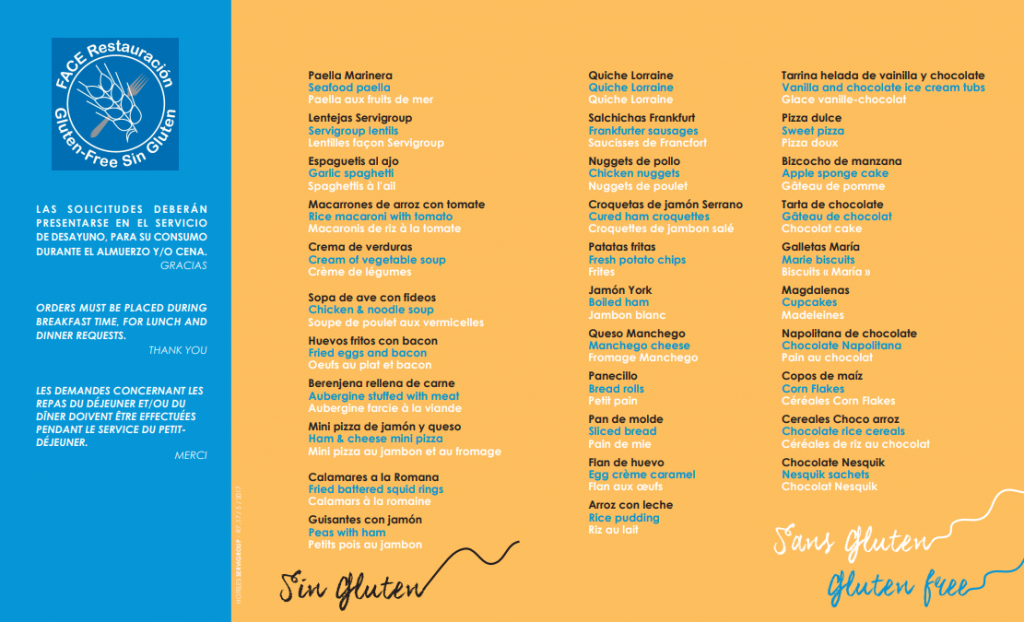 Voor hun glutenvrije vakantiegasten hebben ze een speciaal menu opgesteld in samen werking met de FACE (Spaanse Coeliakie Vereniging). Hierdoor ben je gegarandeerd van een menukaart dat 100% zorgvuldig is opgesteld.